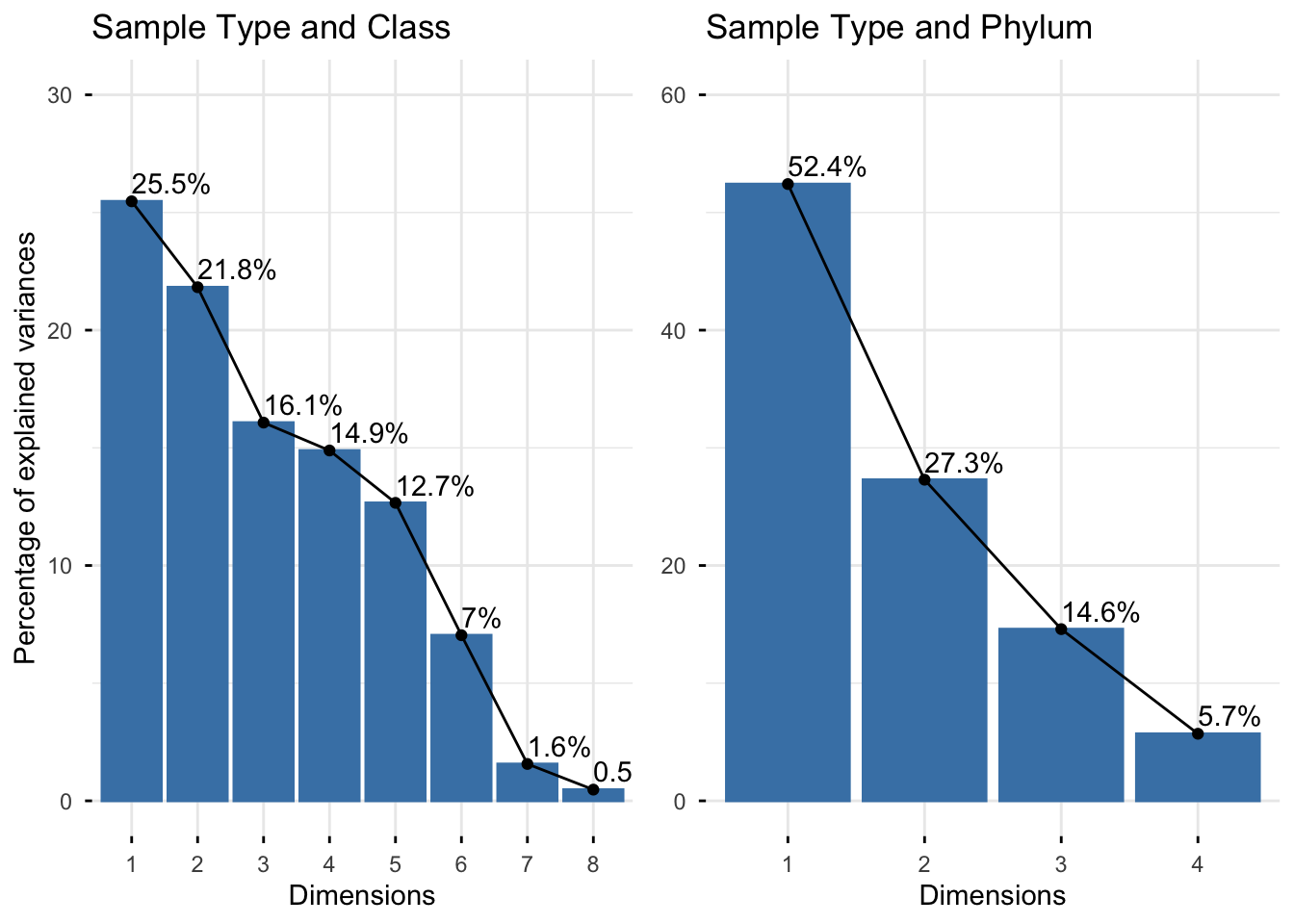 Notably in our first matrix compared to our second matrix, the number of classes exceeds the number of phyla, resulting in a higher-dimensional class matrix. Consequently, reducing the column dimensions of these matrices to 2 diminishes the performance of the first two dimensions, with only 47.29% of the total variation explained, compared to 79.9% when using the higher-dimensional matrices.