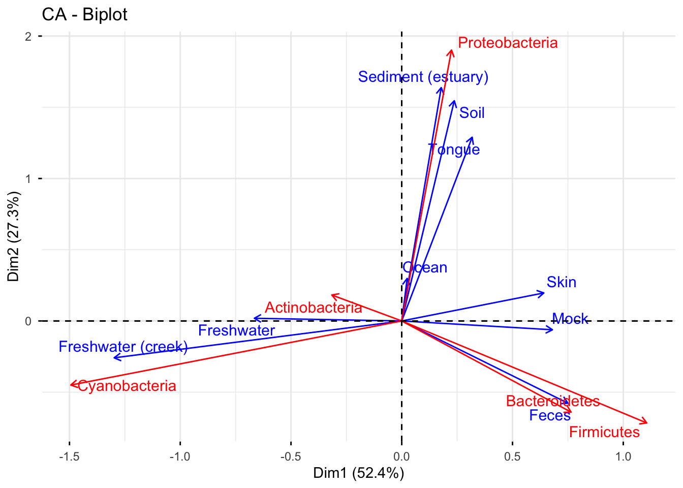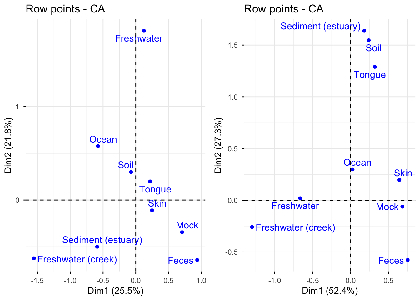 We can see above that dimension 1 is best explained by Freshwater(creek) and Feces while dimension 2 is best explained by Freshwater, Feces and Freshwater(creek), this was also indicated in the original biplot.