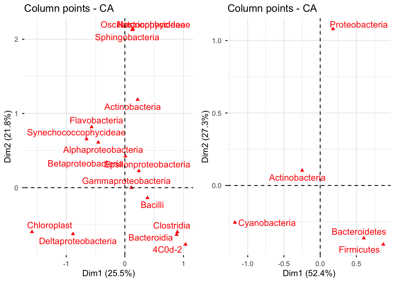 In the first plot, the first dimension is mostly determined by Chloroplast while the second dimension is determined by Oscillatoriophycideae, Nostocophycideae and Sphingobacteria.