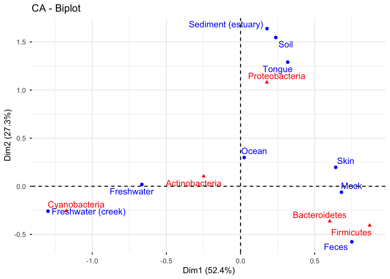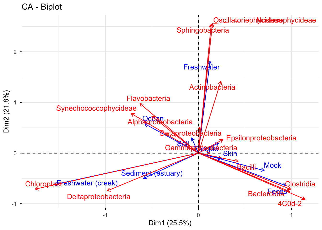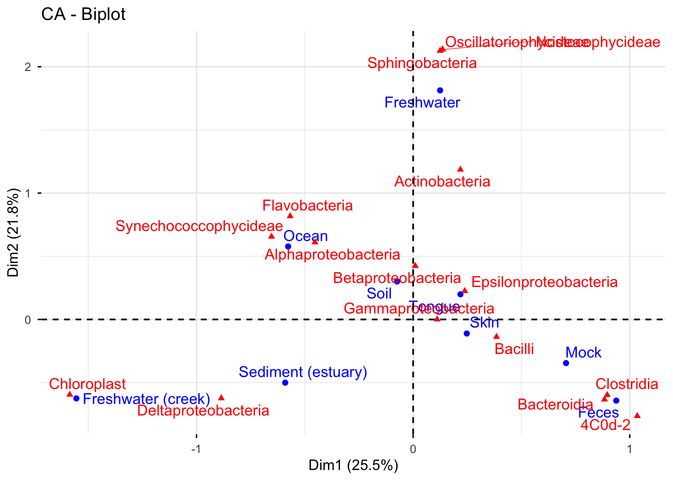 We explored the relationship between microbial composition and the sample type using correspondence analysis (CA), which based on singular value decomposition (SVD) method. More specifically, we aimed to identify which microbial species are more present in certain sample types and if there are any common microbial compositions between different taxonomic classifications.