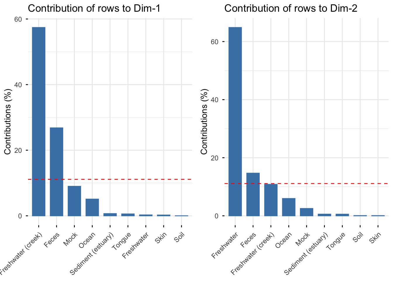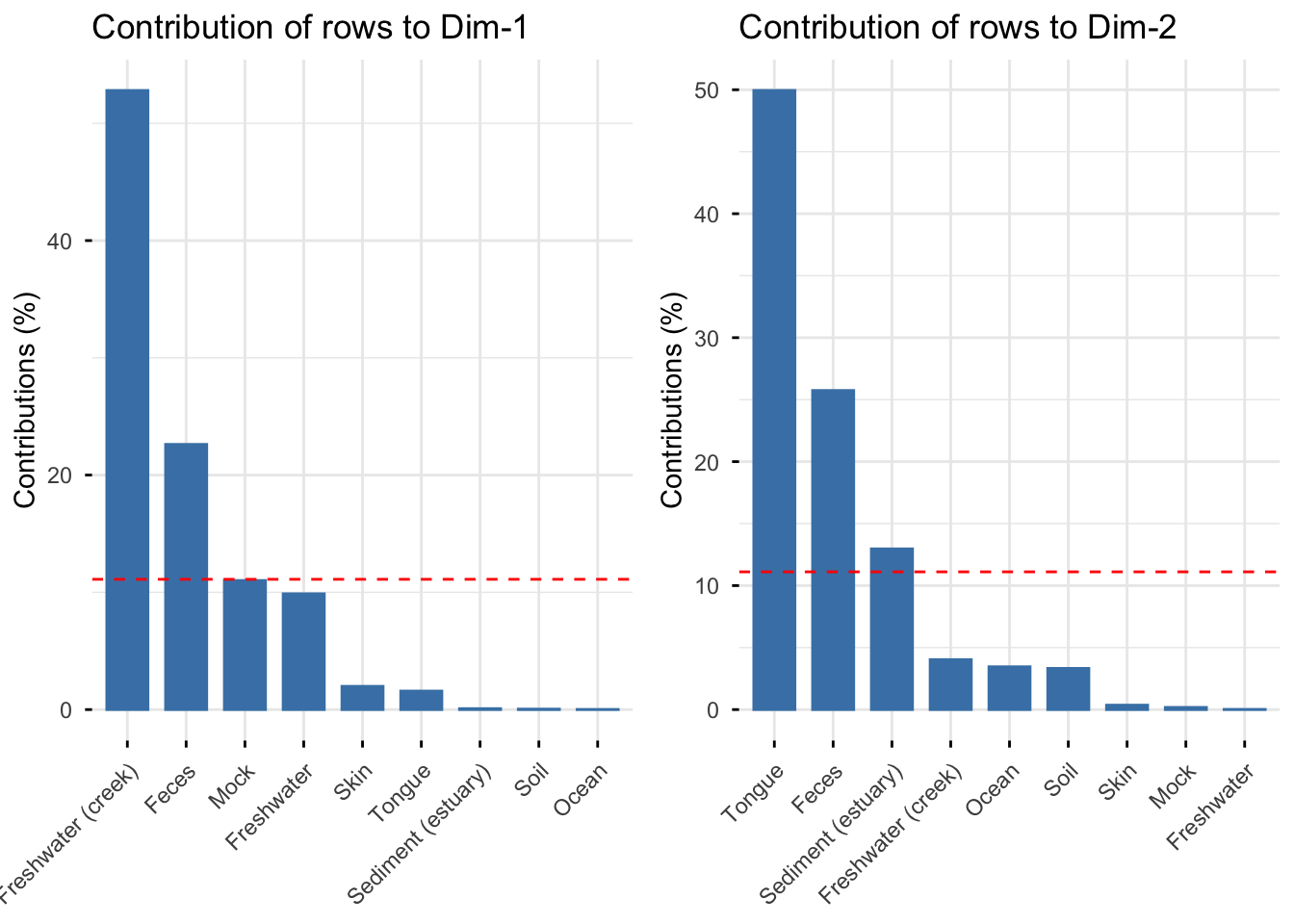 The graph below show the row contributions of each sample type to dimensions 1 and 2, the sample types that contribute most to a given dimension are the most important in explaining the variability in the data. The red dashed line, indicates the expected average value, If the contributions by all sample types were uniform.