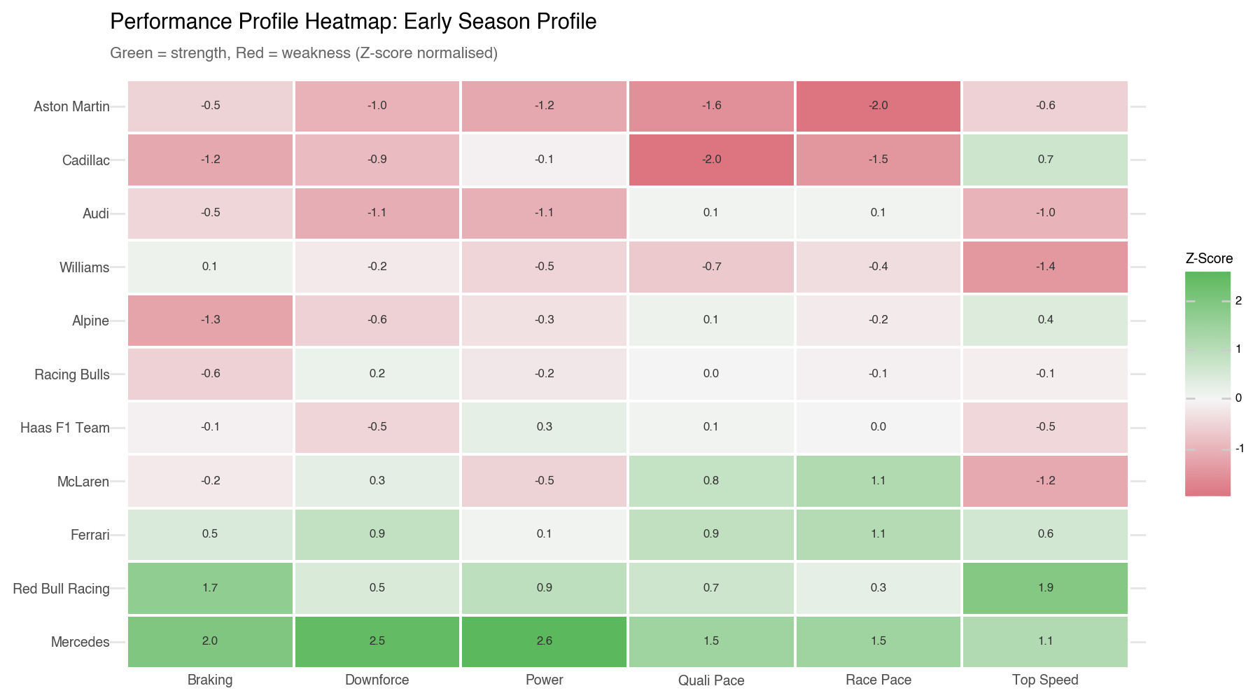 Red Bull is the most striking example. The performance profile places them clearly in the top tier alongside Mercedes, with the highest top speed score of any team on the grid and solid braking performance. In the races, though, they finished 6th and 8th, with mechanical failures striking both Australia (Hadjar DNF) and China (Verstappen DNF). This is not a case where the performance profile analysis was wrong, it is more a case where the race result is misleading. The underlying pace was there; reliability took the points away.