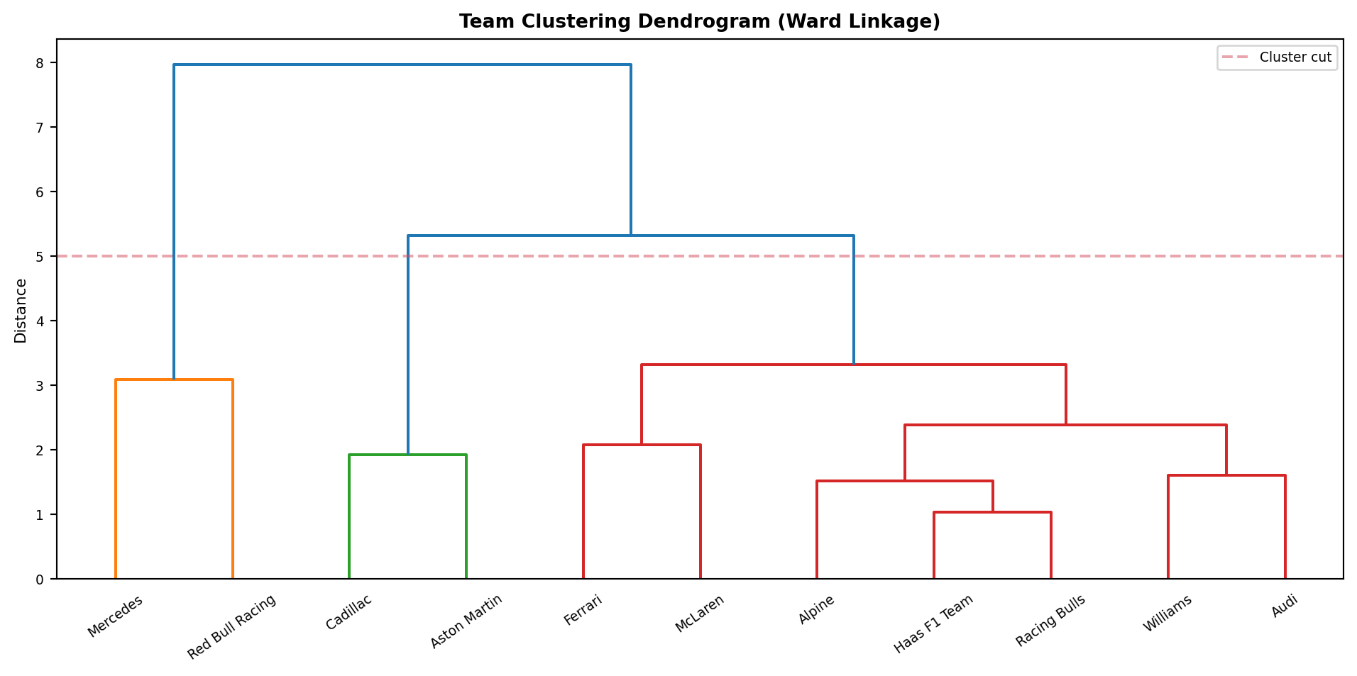 With six performance dimensions per team, we can ask: which teams have fundamentally similar cars? Hierarchical clustering groups teams by the similarity of their performance profiles, revealing shared performance tiers.