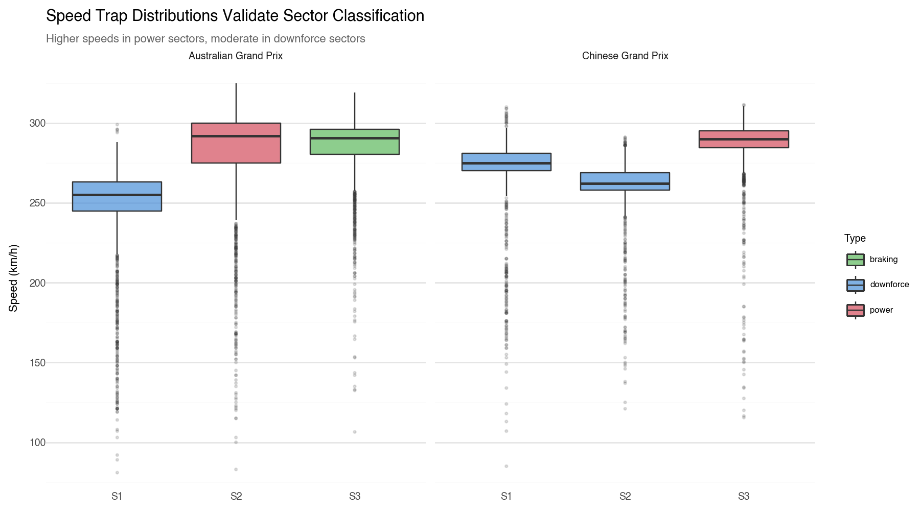 We classify each sector using a combination of circuit knowledge and speed trap validation. The speed traps (SpeedI1, SpeedI2, SpeedFL, SpeedST) tell us how fast cars are travelling at key points, where high speeds suggest straights (power), moderate consistent speeds suggest corners (downforce).