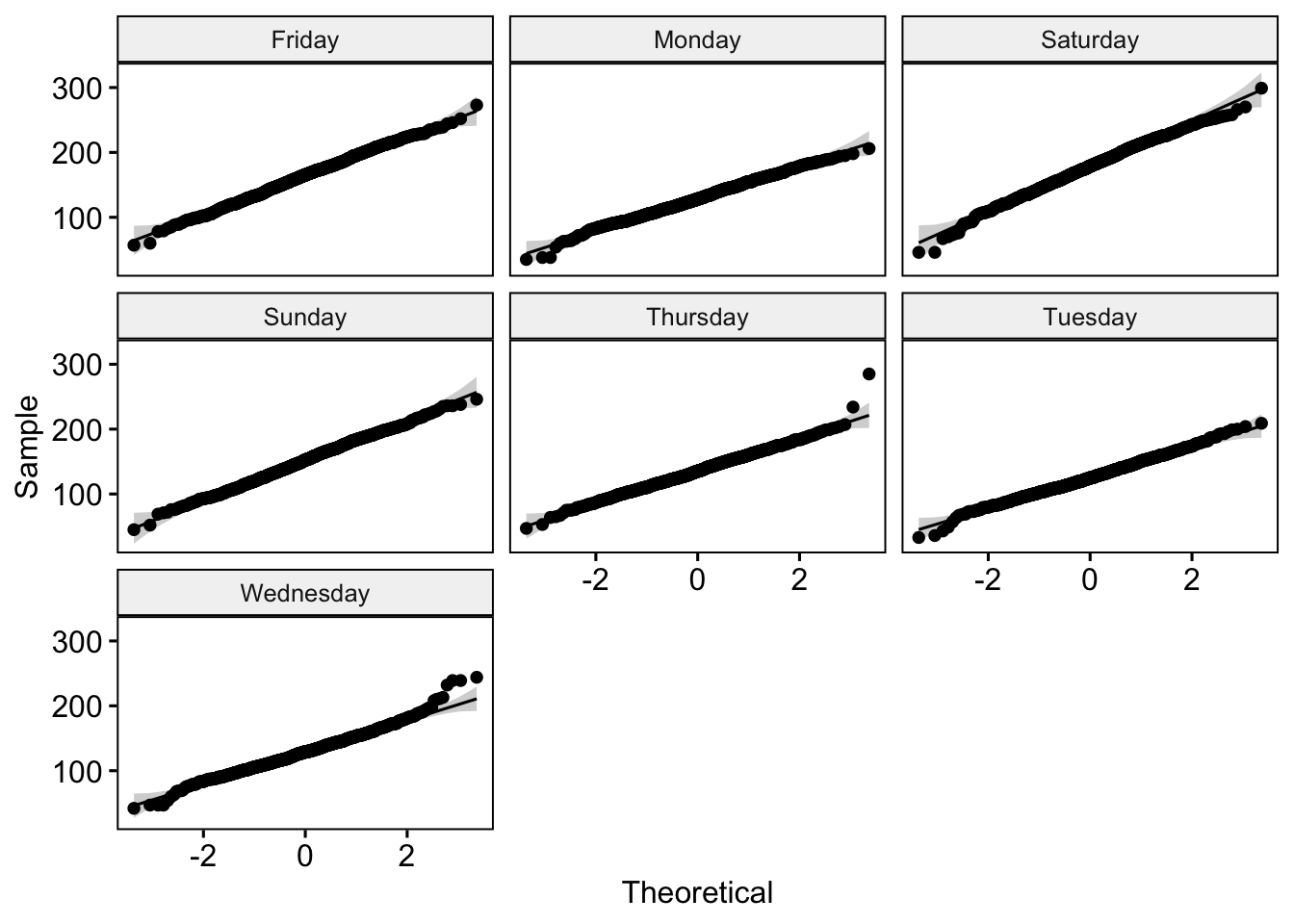 Before applying any model, we first examine whether the number of daily fatalities (fatalities_count) meets assumptions required for common parametric tests. We start by checking normality across weekdays using QQ plots. The QQ plots show to some extent we can assume that the deviations from the normal distribution are not so off, which implies that daily fatalities are can be said to be normally distributed across days of the week.