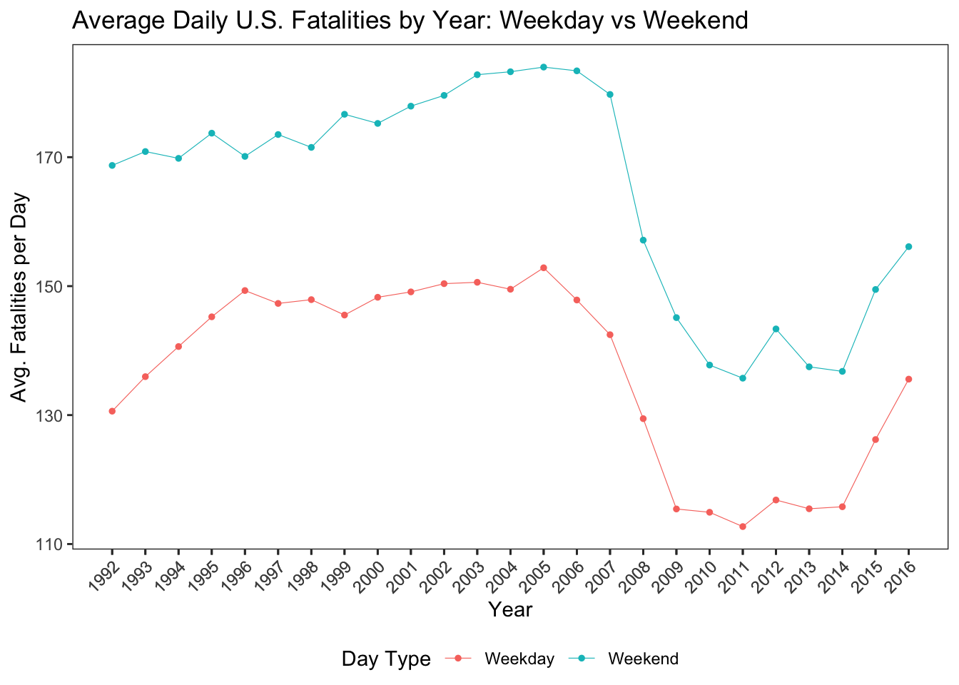 - From 1992 to around 2005, both weekday and weekend fatalities were relatively high.