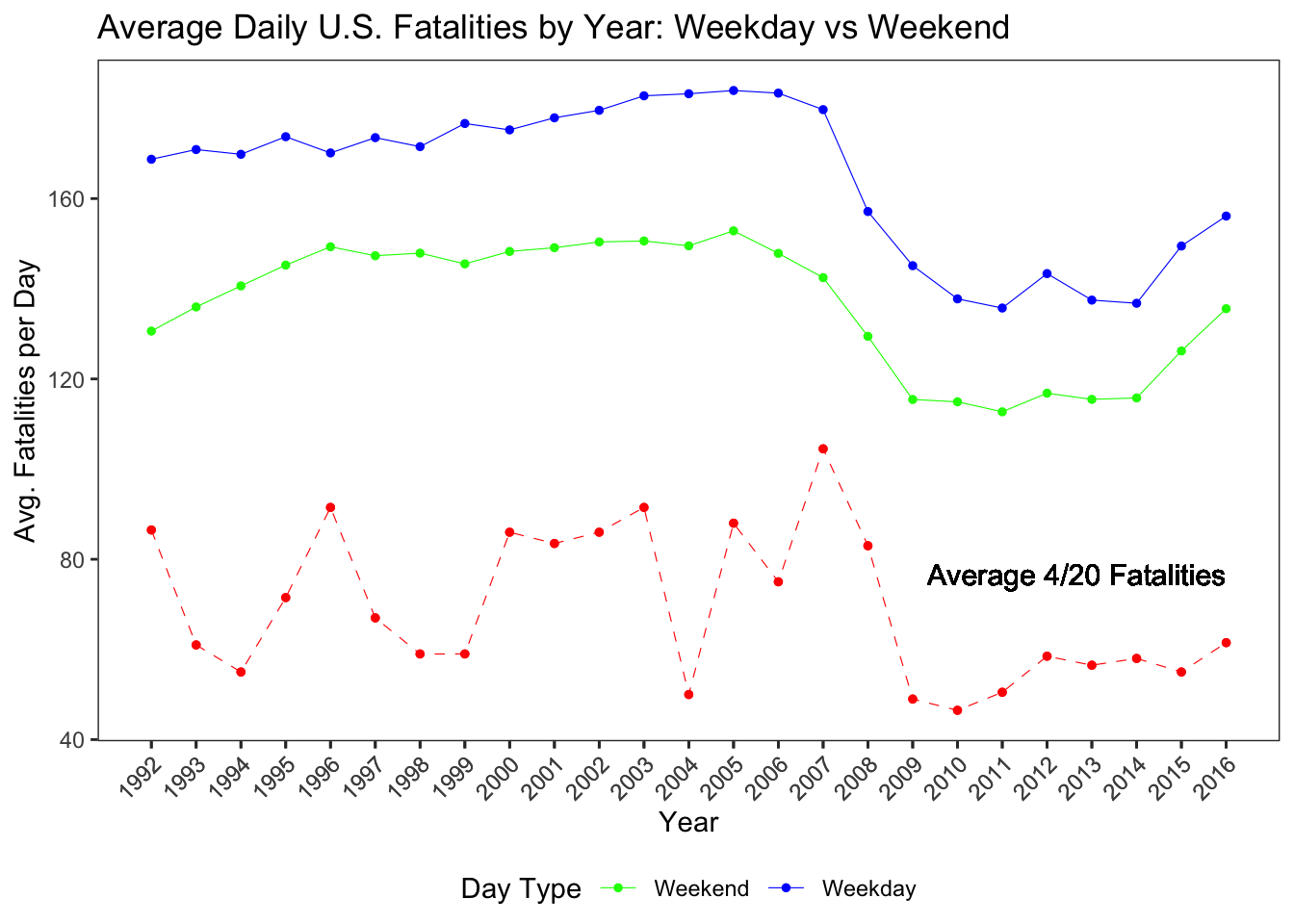 These observations challenge the widely held perception that cannabis-related events on 4/20 lead to more dangerous roads. While the results do not eliminate the possibility of localized risks or isolated incidents, the broader national pattern does not support the idea that 4/20 is a particularly deadly day for drivers. To deepen our understanding of how April 20th compares to other days in terms of fatal crashes over time, we plotted the trend of average daily fatalities across all years, distinguishing between weekdays (in green), weekends (in blue), and April 20th specifically (in red). This allowed us to show how 4/20 fatalities track against broader national trends on regular days.