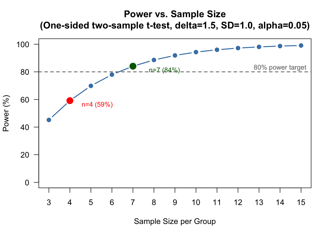check_default <-power.t.test(n =4,delta =1.5,sd =1.0,sig.level =0.05,power =NULL,type ="two.sample",alternative ="one.sided",strict =TRUE)cat("Power with n=4 per group:", round(check_default$power *100, 1), "%\n")