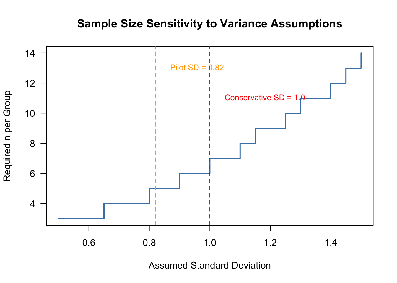 sd_range <-seq(0.5, 1.5, by =0.05)n_required <-sapply(sd_range, function(s) {ceiling(power.t.test(n =NULL, delta =1.5, sd = s, sig.level =0.05, power =0.80,type ="two.sample", alternative ="one.sided", strict =TRUE )$n)})plot(sd_range, n_required,type ="s", col ="steelblue", lwd =2,xlab ="Assumed Standard Deviation",ylab ="Required n per Group",main ="Sample Size Sensitivity to Variance Assumptions",las =1)abline(v =0.82, lty =2, col ="orange", lwd =1.5)text(0.85, max(n_required) -1, "Pilot SD = 0.82", col ="orange", pos =4, cex =0.85)abline(v =1.0, lty =2, col ="red", lwd =1.5)text(1.03, max(n_required) -3, "Conservative SD = 1.0", col ="red", pos =4, cex =0.85)