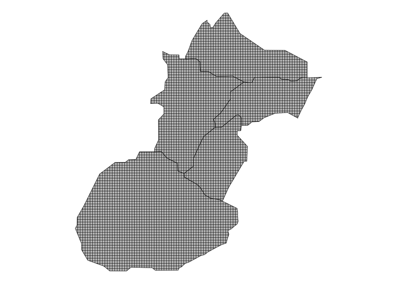 After trimming the grid to the district boundaries, we can plot the result to confirm everything worked as expected. The clipped grid now contains only the cells that fall inside the study area, a total of 5,097 grid cells within the five selected districts give us a clean base for assigning and visualizing population density.