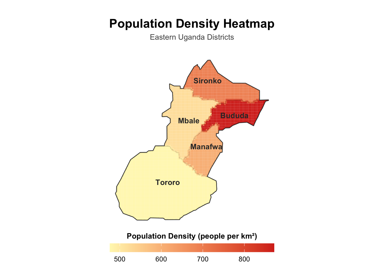 In this tutorial, we’ll build a simple population density heatmap in R using Uganda’s most recent population census outputs from the Uganda Bureau of Statistics. We’ll pull district boundaries via the rgeoboundaries package, then combine those boundaries with UBOS district-level totals to create a grid-based heatmap for five districts in Eastern Uganda: Mbale, Sironko, Bududa, Manafwa, and Tororo.