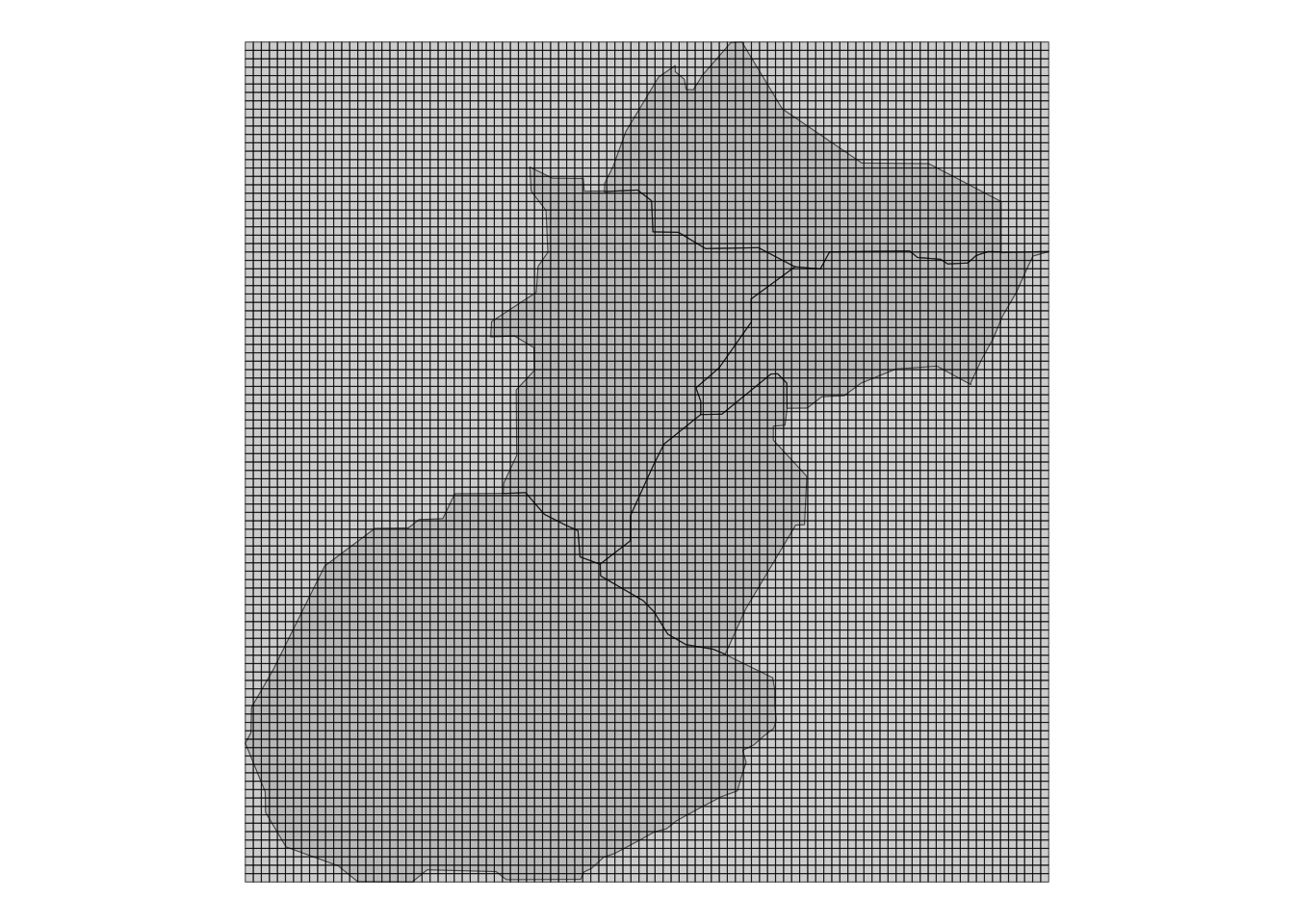 This creates 10,000 small square cells covering the entire bounding box of our five districts.